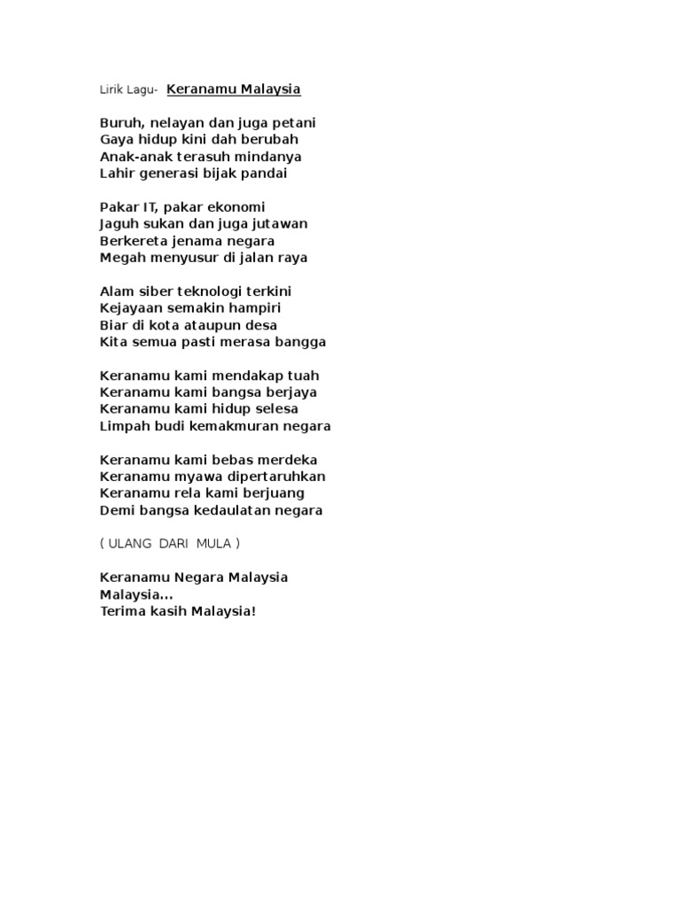 Oleh lirik yang terlampau puitis. Lirik Lagu Keranamu Malaysia Lagu Patriotik chorus Buruh nelayan dan juga petani Gaya hidup kini dah berubah Anak-anak terasuh mindanya Lahir generasi bijak pandai. Buruh nelayan dan juga petani Gaya hidup kini dah berubah Anak-anak terasuh mindanya Lahir generasi bijak pandai Pakar IT pakar ekonomi Jaguh sukan dan juga jutawan Berkereta jenama negara Megah menyusur di jalan raya Alam siber teknologi terkini Kejayaan semakin hampiri Biar di kota ataupun desa Kita semua pasti merasa bangga Keranamu kami mendakap tuah.
